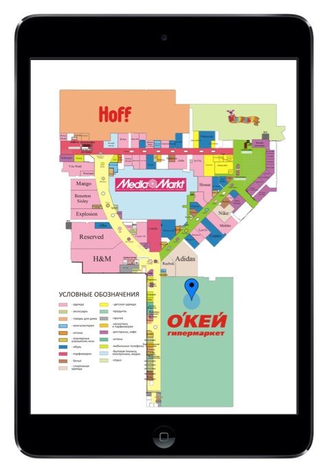 После установки iBeacon-маяков в ключевых точках здания, мобильное приложение будет в любой момент понимать где именно находится пользователь - показать его точное положение на карте, построить маршрут к интересующей его точке (магазин, парковка, ресторан, туалет и т.д.).