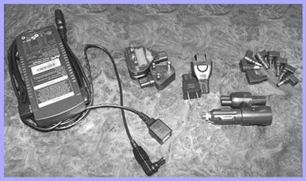 В комплект сумки входит сетевой фильтр-преобразователь, к которому можно прицепить кучу вилок всех мыслимых видов и конструкций, а также ворох разъемов для всевозможных компьютеров, список которых занимает несколько страниц (жаль только, что RoverBook Discovery B215 в этом списке отсутствовал). Такое ощущение, что эти вилки подходят не только к любой розетке, но вообще ко всему: от автомобильного прикуривателя до какого-нибудь экзотического чудовища с четырьмя разъемами. Воткни их в коробку из-под ботинок и все в порядке - есть контакт и напряжение. Кроме того, имеется USB-порт и дупликатор, к которому можно подключить два устройства для зарядки по USB.