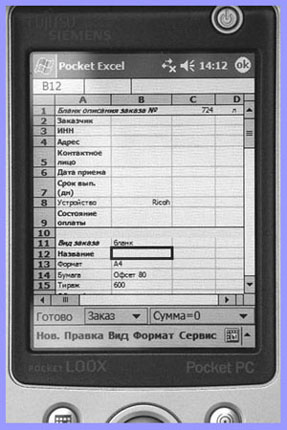 Запуск программы "Заказ" на КПК показал, что для реальной эксплуатации программа требует доработки - в Pocket Excel'е отсутствует VBA. А у нас кроме заполняемой таблицы - целая программа на Бейсике. Расчеты, выполняемые в программе, необходимо заменить формулами в таблице.