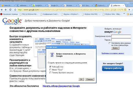 Другая интересная "штучка" от Google - это создание ярлыков для веб-приложений. Не секрет, что таких сервисов сейчас действительно очень много - это и текстовые процессоры, и фоторедакторы, и даже онлайн-сервисы для нелинейного редактирования видео. Вот как раз для подобных сайтов в Google Chrome есть возможность вывода ярлыков быстрого доступа на Рабочий стол, панель Быстрого запуска или в меню "Пуск" (требуется установка Google Gears). В свойствах такого элемента будет прописываться полный путь до исполняемого файла браузера с параметром запуска сервиса в виде вкладки. В отличие от другого продукта, тоже работающего на движке Mozilla Firefox, Flock, в Google Chrome нет никакой интеграции с Web 2.0 ресурсами, то есть так называемым "социальным вебом". Конечно, отдельные ярлыки до подобных ресурсов (на скриншоте мы создаем шорткат под Google Docs) могут в какой-то мере упростить жизнь обычному пользователю, но не намного - с некоторыми сайтами, например, отечественным фоторедактором FanStudio (