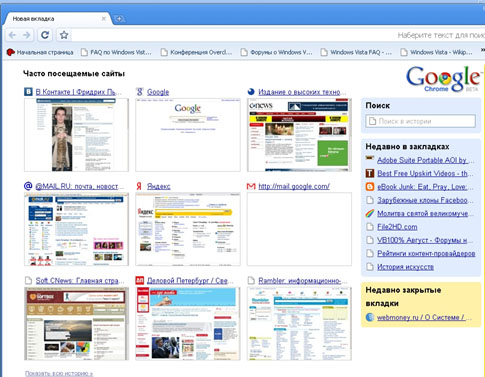 Стартовая страница браузера имеет весьма лаконичный дизайн - почти как страница поисковика Google. Она состоит из четырех частей - матрицы 3*3 из превью часто посещаемых сайтов (дежа вю с Opera Browser, однако в нем они задаются вручную, а в Google Chrome формируются на основе истории посещений), панели недавно добавленных в закладки страниц, а также последних закрытых вкладок, а также панели поиска в истории посещений. Так как Google Chrome построен на движке Mozilla Firefox (причем третьей версии), то понятное дело, в нем используются практически все те же функции, что и в прародителе (например, есть возможность поиска по тегам в адресной строке). Инновации встречаются именно там, где их не ждут: в Google Chrome появился режим работы "инкогнито". Это означает, что открытые страницы не будут записываться в журнал посещений, а cookies с этих сайтов будут удаляться сразу же при закрытии вкладки или окна браузера. При этом следует помнить, что шансы "запалиться" все равно существуют: как предупреждают разработчики, если вы войдете в аккаунт Google на странице