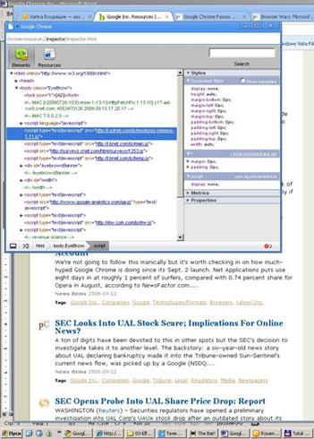 От Mozilla Firefox в новом браузере остался в наследство удобный вьювер HTML-кода с подсветкой синтаксиса. Тем не менее, команда разработчиков браузере от Google его доработала в лучшую сторону - теперь там присутствует вполне качественная консоль с основной структурой кода: отдельно скрипты, отдельно то, что написано в теге body, отдельно HTML-контент. Кроме того, в соседней вкладке помещены все интерактивные элементы - изображения, видеообъекты, апплеты, которые можно упорядочить для более удобного анализа. Более того, в меню можно выбрать отдельную консоль с отладчиком JavaScript, а также загрузить полностью весь код страницы (как на Mozilla Firefox).
