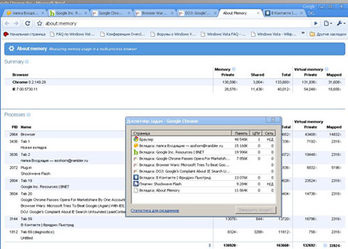 Для гиков в Google Chrome предусмотрен встроенный диспетчер задач (вызывается комбинацией Ctrl+Esc), который показывает все открытые вкладки, сколько памяти они занимают, а также какой поток идет на каждую из них. Если гик оказывается еще и системным администратором, то в один клик мышкой можно сгенерировать весьма детальный отчет об текущем состоянии среды браузера.