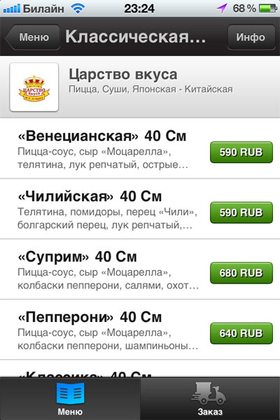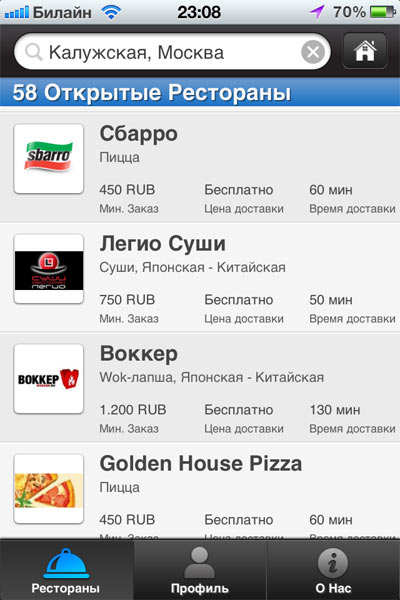 У каждого ресторана в списке указана минимальная сумма заказа, стоимость и среднее время доставки. Кроме того, у многих ресторанов действуют различные акции, наподобие "при заказе от 1000 руб. напиток в подарок" которые также кратко описаны в списке.