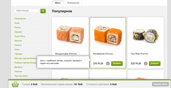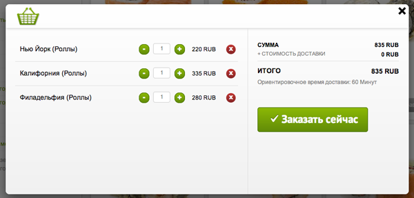 Для оформления заказа необходимо выбрать блюда из предложенного списка на сумму не меньшую минимальной стоимости заказа и нажать на кнопку "Заказать сейчас".