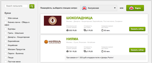После выбора интересующего ресторана необходимо нажать на кнопку "Заказать сейчас" для выбора блюд.