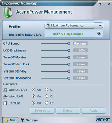 Давайте разберемся с этой проблемой. Для этого идем в меню "Пуск" > "Панель управления" > "Производительность и оборудование" а потом - компонент "Электропитание". Именно здесь и зарыта собака! В отличие от настольного компьютера запустится или стандартная вкладка Windows Электропитание (с добавленными пунктами от производителя ноутбука по более тонкой настройке всех компонентов) или утилита, отвечающая за электропитание. В моем ноутбуке это Acer ePower Management, входящая в пакет фирменных утилит Empowering Technology. В открывшемся окне утилиты выбираю "отключение диска" (Turn Off Hard Disk) и ставлю значение не пять минут после простоя, а как можно дольше или даже "никогда" ("never"). Это значит, что жесткий диск ноутбука вообще не будет отключаться. Это уменьшит износ винчестера, а значит, увеличит срок его работы. Однако это же и сократит срок работы ноутбука от аккумулятора. Что тут можно предпринять? Если вы выехали на какую-нибудь конференцию, где некуда подключить сетевой адаптер, носите с собой запасной аккумулятор с полной зарядкой. Щелк-щелк - замена аккумулятора займет не более минуты. Это сохранит жесткий диск и ваши нервы.