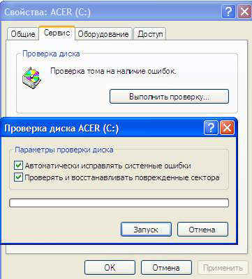 Для того чтобы продлить жизнь своему винчестеру, нужно регулярно проверять его на наличие ошибок. Делается это просто. Входим в "Мой компьютер", в свойствах диска на которой установлена ОС выбираем вкладку "Сервис" и жмем на кнопку "Выполнить проверку". В открывшемся окне обязательно ставим галочки "Автоматически исправлять системные ошибки" и "Проверять и восстанавливать поврежденные сектора". Затем нажимаем "Запуск". Далее надо согласиться с тем, что проверка будет выполнена при следующей перезагрузке. Имейте в виду - процедура это долгая, занимает около получаса и требует перезагрузки системы. Впоследствии имеет смысл проверить и другие разделы диска. Данная программа Windows хорошо справляется с мелкими повреждениями, но не с ситуациями, когда ОС сообщает, что винчестер поврежден и требует замены (как было описано выше). Однако есть возможность вызвать эту команду из командной строки, и тогда она начинает буквально творить чудеса.