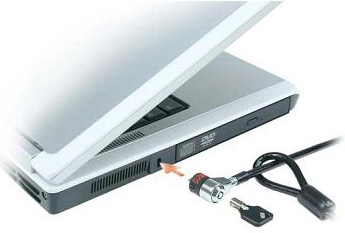 Чтобы этого не произошло, не стоит его оставлять где попало. Все производители предлагают замки для ноутбуков Kensington MicroSaver - металлизированная щель в корпусе, пропустив в которую специальный стальной тросик можно пристегнуть ваше сокровище к чему-нибудь не совсем мобильному - перилам или батарее центрального отопления. Это что-то вроде цепей для приковывания велосипедов к столбам. Достаточно надежная защита, вор не будет возиться с замком у всех на виду, а перекусить тросик - нужны специальные кусачки.