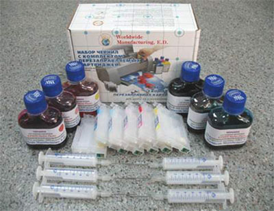 Если 20 мл чернил в стандартном картридже хватает на 200-250 страниц, то можно себе представить, на сколько хватит полулитровых емкостей. Установка не слишком трудная: вставляете картриджи, присоединяете к емкости с чернилами, прокладываете шлейф, чтобы он не мешал движениям печатающей головки, прокачиваете систему, чтобы в трубках и картриджах не осталось воздуха, - и вперед. Такой способ, правда, годится только если на принтере предполагается печатать очень много. Как минимум 1 страницу в 2 дня каждым цветом, чтобы чернила в печатающей головке не засохли, иначе принтер в лучшем случае будет "полосить", а в худшем потребует себя заменить.