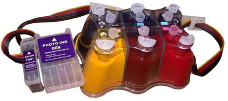 Для тех, кто печатает очень много и часто, будет логичной установка СНПЧ - системы непрерывной подачи чернил. Эстетически это выглядит не очень приятно, но себестоимость отпечатка уменьшается в несколько десятков раз. Системы представляют собой те же самые картриджи, как и в предыдущем случае, с отверстиями в крышках и, если это необходимо для работы принтера, с самообнуляющимися чипами. Только отверстия служат не для залива чернил, а для эластичного шлейфа - пучка трубочек, которые соединяют картридж с внешними емкостями для чернил.