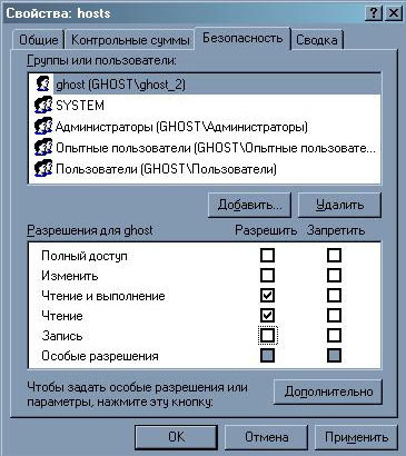 При создании пользователя с "ограниченным доступам" многие права выставляются автоматически, блокируется доступ к папкам и файлам: WINDOWS; PROGRAM FILE; Documents and Settings (кроме папки пользователя C:\Documents and Settings\ghost_2\). Многим этого в принципе достаточно, но к примеру мы используем denwer он изменяет информацию в файле hosts в папке C:\WINDOWS\system32\drivers\etc\ доступ на запись запрещен, значит, denwer будет работать только в режиме localhost. А нам нужно, чтобы он мог запускаться нормально из-под пользователя с "ограниченным доступом". Выбираем свойства этого файла и добавляем нашего пользователя и его права, для добавления пользователя жмем кнопку "Добавить...", в появившемся окне жмем кнопку "Добавить..." и "Поиск", в окне появятся все пользователи данного компьютера.