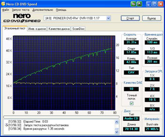 Первая закладка называется "Эталонный тест", уже при помощи одной только ее можно узнать очень многое о диске, который вы решили протестировать. Большую часть данного окна занимает поле для вывода двух графиков. Зеленая линия - скорость считывания данных, желтая - скорость вращения шпинделя в тысячах оборотов в минуту. В современных дисководах диск в чреве привода вращается с очень высокой скоростью: 8-9 тысяч об/мин. Например, коленчатый вал двигателя во всем знакомых "Жигулях" может вращаться не больше, чем 5500 об/мин, а тут чуть ли не в 2 раза больше. Но это так к слову.