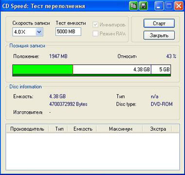 Перепрожиг, или Overburning, - это процесс записи информации на диск объемом большим, чем на ней написано. В этом случае для записи дополнительных данных используются так называемые резервные дорожки диска. На CD болванках имеется некоторый резерв дорожек, на которых может быть записаны файлы. Обычно он составляет не менее 2 минут аудио-данных или 17,56 Мбайт обычной информации. Аналогичные дорожки имеются и на DVD дисках. Соответственно, суть перепрожига и заключается в том, чтобы использовать эти резервные дорожки для свои нужд, и записать туда слегка непоместившиеся в основном пространстве данные. На самом деле количество резервных дорожек может быть и больше. На CD болванки хороших производителей -Verbatim, TDK, Philips мне удавалось записать и 740 Мбайт информации вместо 700. А на DVD диски чуть меньше 60 Мбайт получалось вместить. В общем, сколько можно перепрожигать - зависит от конкретной болванки и конкретного привода. Выяснить это можно с помощью теста. Как раз в программу Nero CD-DVD Speed входит нужный инструментарий. Называется он "Тест переполнения" и находится в меню "Дополнительно". После прохождения теста вам будет сказано, сколько информации привод может уместить на диске данного производителя. Тест проходит опять же в режиме эмуляции записи и диск при этом не портится.