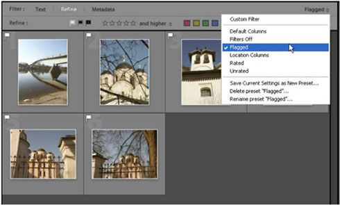 При отборе импортированных изображений для их дальнейшей работы пользователь сортирует (фильтрует) снимки. Один из вариантов - ставить рейтинг на понравившийся снимок. Цветные метки могут быть очень наглядными, так как меняют цвет рамки эскиза. В качестве иллюстрации я командой Edit (Редактирование) > Select by Flag (Пометить флажком) > Flagged (Зафлажковано) отметил несколько снимков, а затем выполнил фильтрацию снимков командой Flagged (Зафлажковано). Отмеченные флажками изображения были найдены и выведены на экран