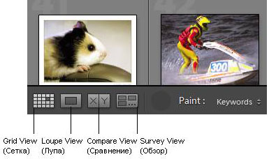 Вид фотографий в центральной части главного окна Lightroom зависит от режима их просмотра. Если присмотреться к линейке под центральной частью главного окна программы, то можно определить четыре режима просмотра, и для каждого из них есть своя кнопка быстрого доступа.