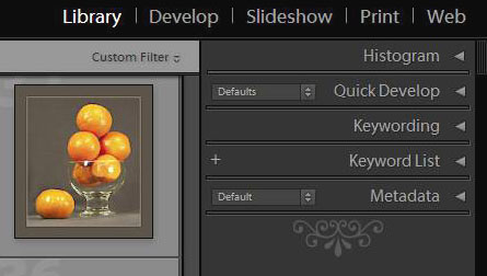 Окно (панель) справа служит для просмотра гистограммы выбранной фотографии, общей коррекции ее изображения, просмотра и ввода ключевых слов. Содержимое правой панели меняется в зависимости от ее режима. На рисунке данная панель показана в режиме Library (Библиотека).