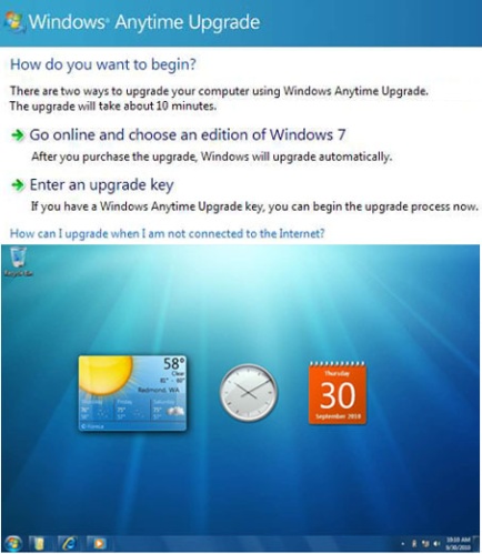 Первый и один из основных вопросов, мучающих пользователей при переходе на новую версию системы, касается ее требований к аппаратному обеспечению компьютера. Если вспомнить, сколько копий было сломано о завышенные конфигурации "железа", на которых Windows Vista показывала скромные результаты производительности, то заявления Балмера, что система будет "получше Висты" (a better Vista), могут показаться чем-то вроде насмешки. На деле системные требования практически те же самые: рекомендуемая конфигурация компьютера должна иметь процессор не ниже 1 ГГц Intel Pentium III (или аналогичного), 1 Гб ОЗУ на борту, 10 Гб свободного места на диске, естественно, DVD-привод (для установки с дистрибутива), сетевой адаптер и SVGA-совместимую видеокарту и монитор. По сравнению с Вистой ничего кардинально нового не прибавилось за исключением нескольких гигабайт на диске (однако чистая установка Windows 7 занимает 8 Гб против 11 Гб у Висты). Расходуются они на хранение, как ни странно, компонентов системы различных изданий - то есть можно будет переходить с базовой версии на профессиональную без переустановки системы и даже без вставки диска. С этой целью разработчики решили переделать Windows Anytime Upgrade - теперь на апгрейд системы потребуются считанные минуты, только найдите ключ для разблокировки тех или иных опций.