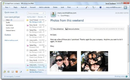 Windows Live Mail используется в качестве замены Outlook Express и Mail в Windows Vista и теперь превращается в симпатичный PIM-клиент с функциями органайзера. Это стало возможным после включения в него Адресной книги и Календаря (видимо, отдельный календарь в стиле MacOS не приглянулся пользователям Висты). Сам почтовый клиент мало изменился - единственная новая существенная опция относится к отправке фотографий. Теперь можно не захламлять почтовые ящики многопиксельными картинками, а отправлять их эскизы в теле письма, нажав на которые пользователь сможет докачать полную фотографию с Windows Live.