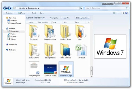 Внешний вид Проводника претерпел некоторые косметические улучшения. В частности, теперь при копировании файлов отображаются их имена (прямо как в файловом менеджере!), а Избранное содержит ссылки на пользовательские папки Мои рисунки, Мои видеозаписи и Мои документы, украшенные соответствующими, а не стандартными иконками. Повысилось и общее юзабилити системы поиска - теперь появились отдельные поиски по пользовательским критериям (найти все документы, найти все данные на съемном носителе и так далее). Именно на эту "фишку" и возлагают разработчики большие надежды - инновационный поиск по пользовательским файлам появился еще в Windows Vista, а в Windows 7 его доработали до уровня продвинутых медиаменеджеров. Теперь данные можно искать не только на локальном компьютере, но и на всех медиаустройствах, а также в домашней сети (если она настроена для компьютеров). Плюс ко всему можно создать и общий каталог и разграничить доступ к нему - как внутри сети, так и извне (функция прямого доступа без создания VPN).