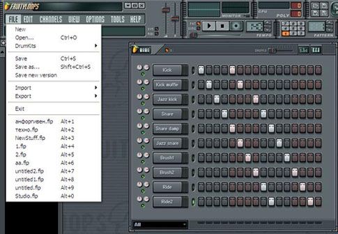 Для начала рассмотрим меню "Файл". Это меню почти всегда одинаково для всех программ, с незначительными вариациями. "New" - начать новый проект, "Open" - открыть файл (в этом случае появляется окно, которое по умолчанию открывает программную папку "Loops", в этой папке находятся все ваши проекты). Очень полезна вкладка "Drumkits", она содержит около двадцати барабанных партий. В принципе, с барабанов все и начинается.