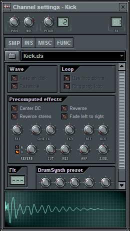 Если мы заглянем в самую нижнюю вкладку "Channel presets", то обнаружим там загрузчик сэмплов, "Sampler". Есть возможность загружать собственные сэмплы в формате wave. Для этого нужно записать свой голос, если мы хотим наложить его на композицию, или конвертировать в wave готовую композицию, к которой нам хотелось бы добавить эффектов. При максимально развитой фантазии результат получается потрясающим. Разве никому не хотелось когда-нибудь поиздеваться над какой-нибудь идиотской песней?