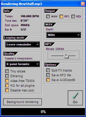 Композиция готова. Мы решили записать ее в формате mp3. В меню файл находим "Экспорт", затем "mp3 file ..." Открывается окно "Сохранить как..." (эту операцию можно проделать во вкладке "Сохранить как..."). Называем нашу композицию и смотрим, где она сохранится. По умолчанию все проекты и конечные файлы сохраняются в программной папке "Loops". Жмем "Сохранить", и в открывшемся окне давим на зеленую галочку с надписью "Go". В течение нескольких мы получаем аудио-файл нашей композиции.