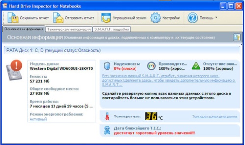 Еще ниже находятся показания температурного датчика (Если HDD снабжен этим самым датчиком). Если температура диска повысится до критической, то, в зависимости от ваших настроек, программа станет мигать иконкой, выдаст звуковое сопровождение, отправит письмо на Вашу электронную почту, или даже уложит ноутбук спать - переведет его в спящий режим. Если для стационарных компьютеров предельная температура установлена на 55°С, то на некоторых ноутбуках она несколько выше, потому что их жесткие диски больше греются, чем в обычных компьютерах. Однако в нормальном режиме работы температура не поднимается выше 35-45°С.