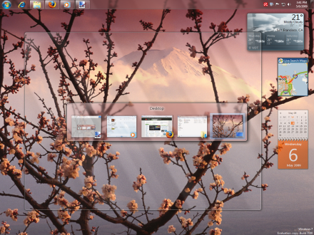 AeroPeek показывает открытые на рабочем столе приложения, когда вы наводите курсор мыши на правую часть панели задач, именуемую "Show Desktop". Такого же эффекта можно добиться нажатием Alt+Tab. (Этот скриншот был снят с Windows 7 Release Candidate, но в финальной версии Windows 7 он выглядит также / Скриншот сделал Seth Rosenblatt/CNET)