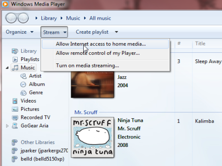 Когда вы запускаете Windows Media Payer в тулбаре можно заметить новую кнопку - Stream. По клике на этой кнопке открывается меню, которое предоставляет 2 выбора: получить доступ к чужому компьютеру и предоставить свой компьютер для других Windows 7 пользователей. Оба этих действия требуют наличия Windows Live ID-аккаунта, который можно бесплатно зарегистрировать. Когда вы ассоциируете Windows 7 WMP с вашим ID с другим Windows 7 WMP ID, вы получаете доступ к мультимедийным ресурсам удаленного компьютера (похожий сервис предоставляет норвежский браузер Opera UNITE - прим. пер.).
