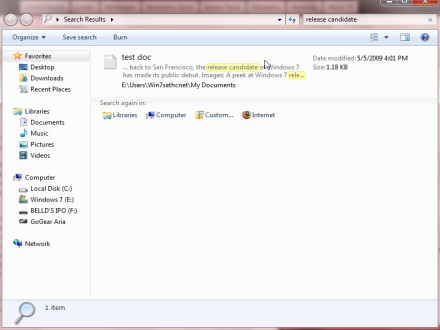 Результаты поиска отображают релевантные предложения в документах пользователя, даже если они находятся не в названии файла, а в его содержании (Этот скриншот был снят с Windows 7 Release Candidate, но в финальной версии Windows 7 он выглядит также / Скриншот сделал Seth Rosenblatt/CNET)