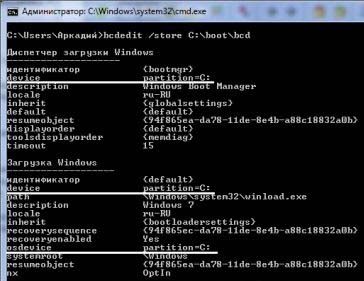 То бишь: в секции "Диспетчер загрузки Windows" параметр device должен быть равен букве нового активного раздела, в нашем случае - С:. в секции "Загрузка Windows" параметры device и osdevice должны быть равны букве раздела, на котором сейчас расположены каталоги Windows. В нашем случае, это тоже С:.