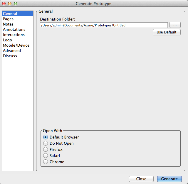 Теперь давайте посмотрим как генерировать прототипы. Для этого служит простая кнопка "Prototype". При ее нажатии открывается окно "Generate Prototype" где указана директория куда будут сгенерированы html-файлы прототипа.