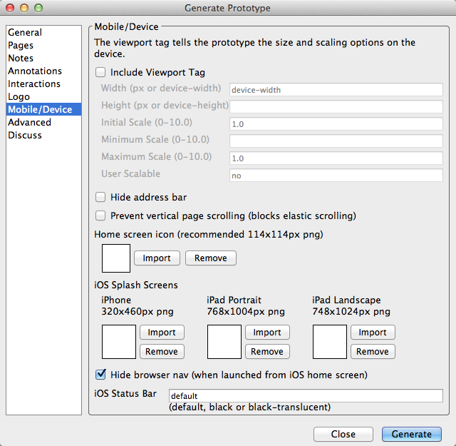 Отдельного внимания заслуживает вкладка Mobile/Device. В ней вы можете добавить иконки, загрузочные картинки, а также выполнить дополнительные настройки для iOS. Таким образом можно сгенерировать прототип, который будет запускаться на мобильных устройствах и будет максимально приближен к родным iOS-приложениям.