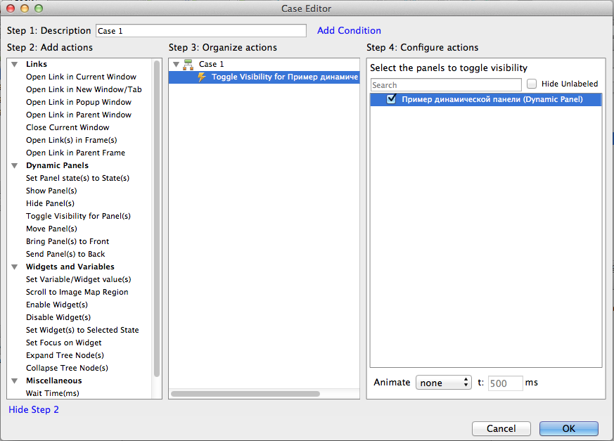 Укажем в свойствах кнопки что при событии одиночного нажатия OnClick производить действие Toggle Visibility for panel(s) для нашей панели "Пример динамической панели".