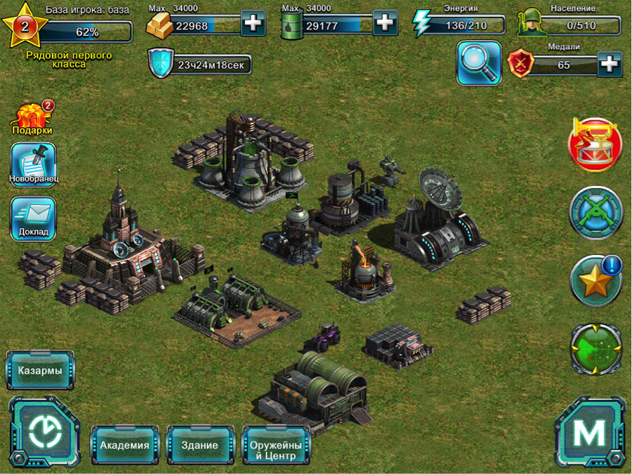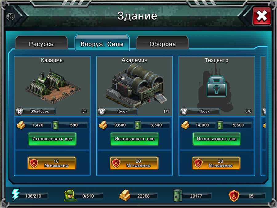 В вашем распоряжении будут три основных вида построек: «ресурсы», «вооруженные силы» и «оборона». Так же у вас будет главный штаб, развитость которого будет влиять на боеготовность всей вашей базы в целом.