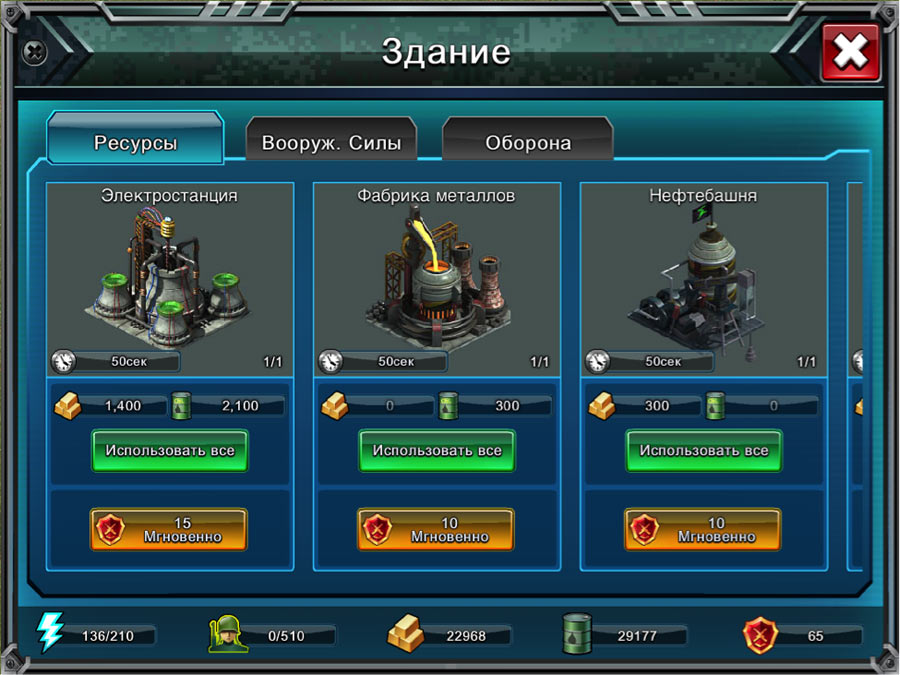 Ресурсы делаться на три типа – это электроэнергия, нефть и металл. Для каждого из них нужно будет построить отдельное здание, которые впоследствии вам придется развивать для того, чтобы повысить выработку ресурсов. Так же вам будет необходимо сооружать хранилища, где будут расположены все ваши запасы.