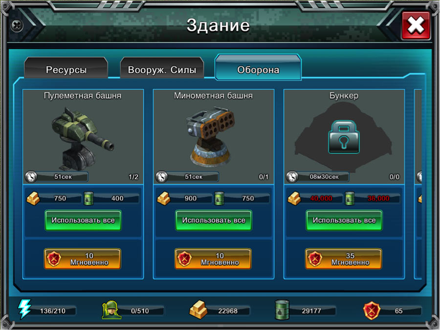 И, наконец, оборонительные сооружения. Сюда входят различные пулемётные и ракетные башни, которые вы сможете расставить по территории своей базы, и они автоматически будут реагировать на приближающихся врагов и уничтожать их. Разумеется, не все виды подобных сооружений будут доступны сразу, но со временем, развивая главный штаб, вы будете получать все новые и новые виды оборонительных сил.