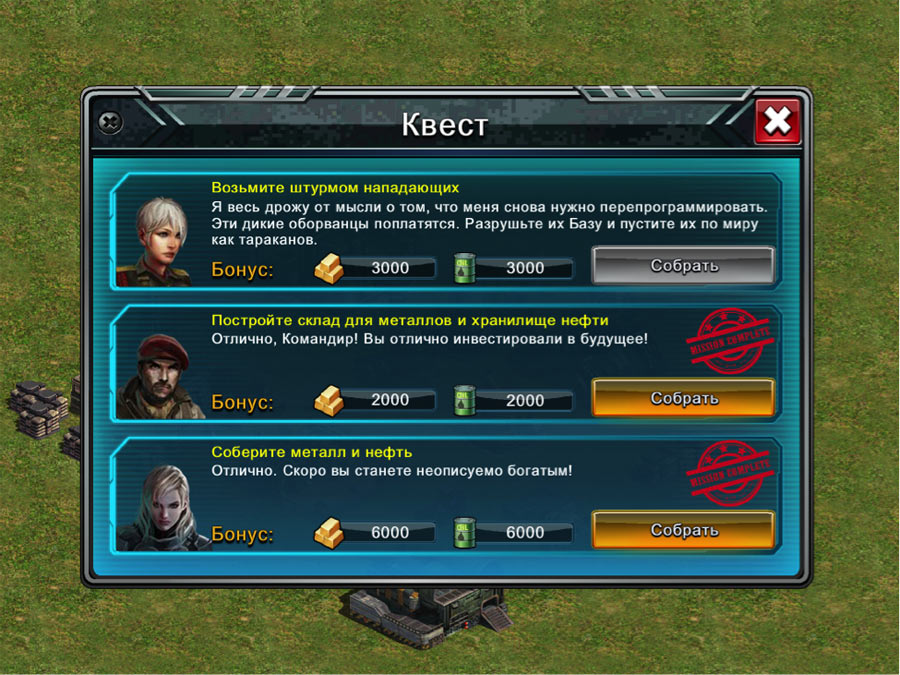 После пройденной тренировки вы перейдете в военный режим с квестами и различными заданиями, выполнение которых будет приносить вам те или иные награды в виде ресурсов или подарков. Вам придется использовать все полученные навыки для того, чтобы добиться высоких результатов, ведь помимо вас в игре будут присутствовать тысячи других реальных игроков, которые будут постоянно строить козни, пытаясь вас захватить, забрав ресурсы. Другими словами, обучение – это только разминка перед глобальной войной за ресурсы, которая развернется на виртуальном поле бое между игроками со всего света.