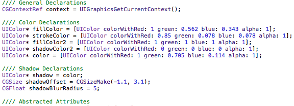 Следует отметить, что Objective-C код, который генерирует PaintCode удобно читаем - переменные названы со смыслом, есть комментарии, и даже логические отступы. Помимо Objective-C кода PaintCode умеет генерировать C# код для разработчиков, привыкших создавать приложения в фреймворке Monotouch.