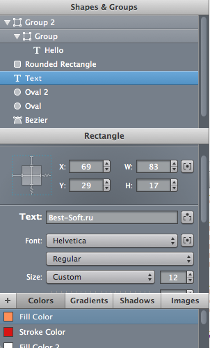 Во-первых, перечислен весь набор использованных в рисунке примитивов. При выделении любого из примитивов в окне ниже отображаются все его свойства - цвет заливки, шрифт, тень и т.д. Выделяя любой из параметров в этом окне можно сразу же видеть его применение на рисунке и в коде. В последнем, третьем окне расположен набор всех цветов, градиентов (поддерживаются как линейные, так и круговые), теней и картинок в рисунке. Все изменения в этом окне также моментально показываются в окне просмотра и кода.