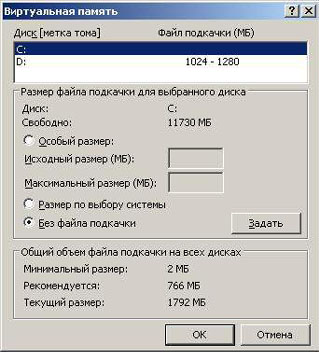 Смотрим размер задействованного файла подкачки, это должно быть примерно 2хRAM (оперативной памяти) плюс-минус 2 Мбайт. Лучше всего использовать файл подкачки на другом логическом диске для более быстрой работы системы.