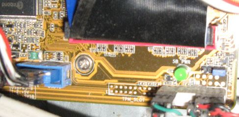 На этой материнской плате светодиод с подписью SB PWR (Stand By Power) притаился в самом уголке.