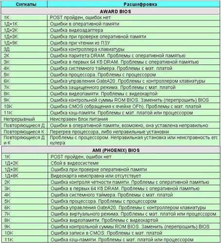 Пищит по-разному, то есть любым образом, кроме одного короткого сигнала. В этом случае все относительно просто, выясняем фирму-производителя BIOS (смотрим либо наклейку на микросхеме BIOS, либо опять привлекаем универсальную книжку-инструкцию к материнской плате) и изучаем таблицу расшифровки сигналов в конце этой статьи, чтобы выяснить, с чем же возникли проблемы. После чего тестируем "плохую" деталь на другом компьютере, чтобы достоверно выяснить, исправна ли она. Если с ней проблемы, значит, просто ее меняем. В большинстве случаев на этом ремонт заканчивается. Хотя и возможны варианты, когда, например, компьютер жалуется на неисправный модуль оперативной памяти, а у друга он работает прекрасно. Можно попробовать другой модуль у себя. Если при заведомо исправном модуле, компьютер опять же не работает, вероятней всего проблемы в материнской плате. Естественно, следует знать тип комплектующих в вашем компьютере и не перепутать память типа DDR c DDR2 и т. д.