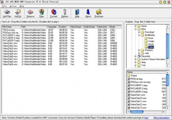 101 AVI MPEG WMV Converter – программа для конвертирования аудио и ведео файлов форматов VCD, SVCD, DVD, AVI, XDIV, MPEG1, MPEG2, ASF и WMV. Программа обладает высокой скоростью работы и приятным интерфейсом.