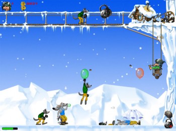 Расправляться с волками поросенок может двумя способами. Проще всего прострелить воздушный шарик - он лопнет от первого же попадания, и голодный серый зверь с жалобным воем рухнет на землю. Но иногда шарик, на котором висит волк, оказывается почти в самом верху экрана - поднять люльку выше поросенок не может, а волк вот-вот доберется до заветной цели. Тогда остается только поливать огнем самого волка. Чем слабее оружие, тем больше попаданий нужно для того, чтобы сбросить волка вниз.