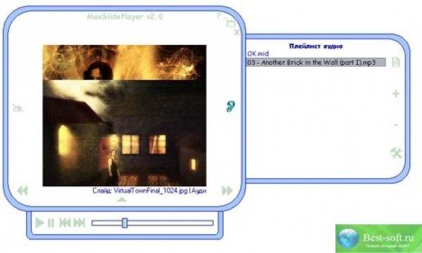 Если вы обладаете огромной коллекцией слайдов, фотографий, картинок и музыки, то эта программа поможет вам в удобном просмотре этих слайдов и прослушивании музыки одновременно! Если же вы начинающий коллекционер, то вместе с программой устанавливается несколько моих слайдов и один музыкальный файл. Программа очень красивая, может менять свою "шкуру". Несколько "шкур"; устанавливаются сразу, однако они очень похожи друг на друга. Я постараюсь выложить на сайт побольше разнообразных "шкур" для этого плейера, однако если вы обладаете художественными данными, то можете делать "шкуры" сами: просто скопируйте существующую "шкуру" из каталога "skins" в этот же каталог, но под другим именем, и можете рисовать, используя графический редактор. Плейер может перемешивать как графические, так и звуковые файлы. Так же возможно автомотическое проигрывание и звуков и слайдов. Программа использует два плейлиста: графический и звуковой. Эти два плейлиста можно сохранять в один файл формата MaxShowFile. Поддерживаются форматы: Bitmap, JPEG, METAFILE, MP3, CDA, WAV, MIDI, MAXSHOWFILE. По мере развития прграммы будут появляться новые форматы. Во второй версии исключены неиспользуемые функции, такие как сохранение плейлистов, иконка в системном трее и многое многое другое. Появился новый формат GIF (в следующей версии планируется добавить еще и PNG). Добавленны эффекты для проигрывания слайдов, можно изменять паузу между аудио-треками, ну и конечно же улучшился интерфейс! Теперь вместо того чтобы устанавливать скины, надо просто изменять цветовые настройки плеера. Появился побелее удобный полноэкранный режим с двумя плейлистами и аудио-панелью.
