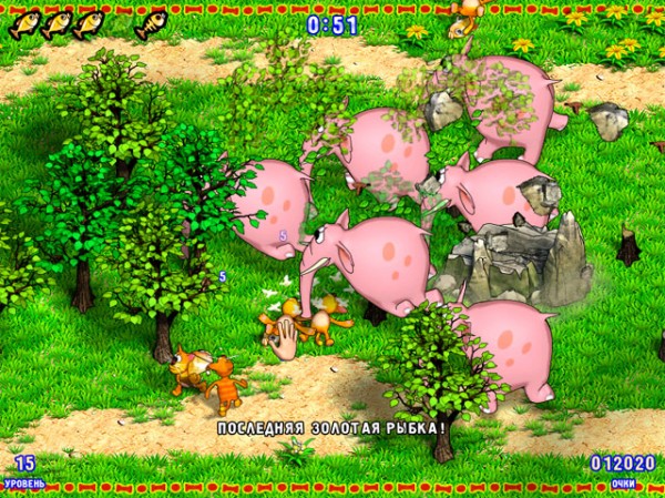 Кроме того, вас ждет более десятка оригинальных бонусов. Например, с помощью специальной дудочки можно вызвать на подмогу табун розовых слонов, которые промчатся по уровню и распугают всех котов. Добыть бонусы очень просто - нужно хорошенько шлепнуть по ближайшему дереву.