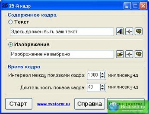 Простая программа реализующая эффект 25-го кадра во время обычной работы за компьютером. Её можно использовать не только как средство внушения, но и для лучшего усвоения какой-либо информации. Например, возможность брать текст из файла позволяет применять эту программу для запоминания иностранных слов.