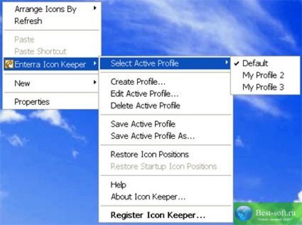 Утилита встраивается в контекстное меню рабочего стола. Позволяет быстро и легко управлять наборами иконок и их расположением на на рабочем столе. Поддерживается создание настраиваемых профилей и быстрое переключение между ними. Позволяет двумя кликами мыши восстановить рабочий стол после сбоя.